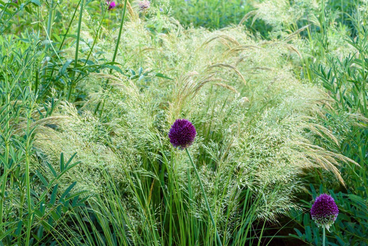 Achnatherum calamagrostis ist vielseitig kombinierbar in wiesenhaften Pflanzungen. Uns gefällt es besonders gut zusammen mit Aster ‚Mönch‘ und Echinacea ‚Alba‘.