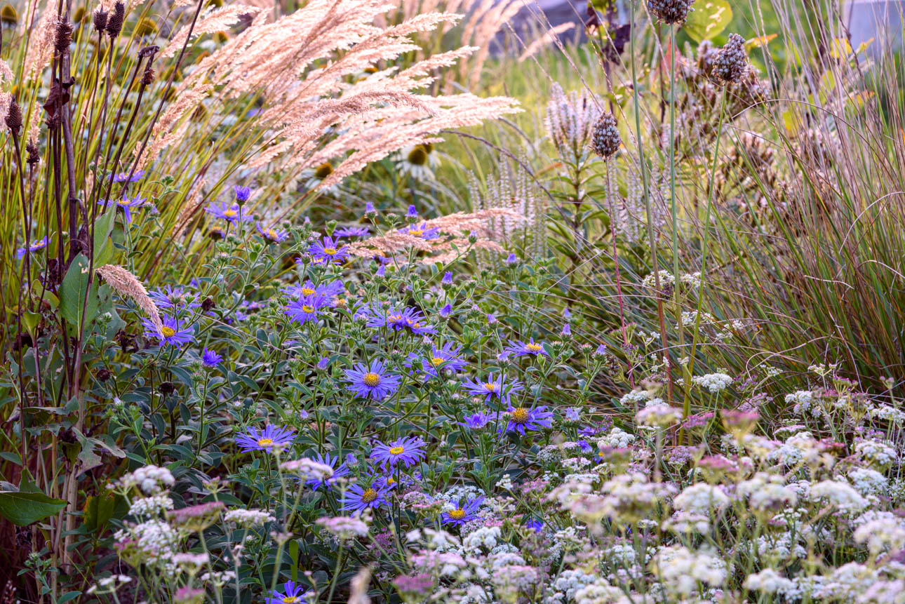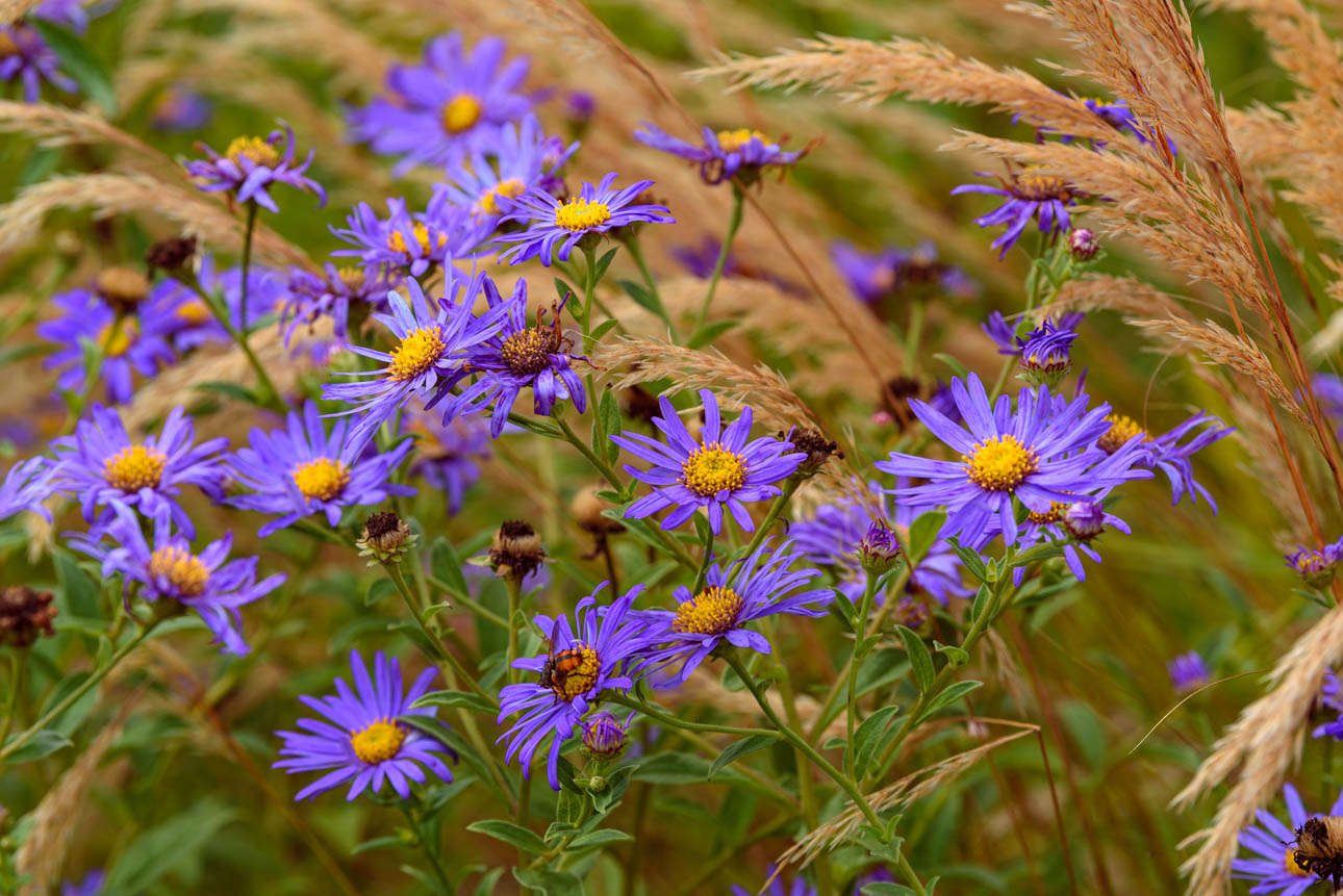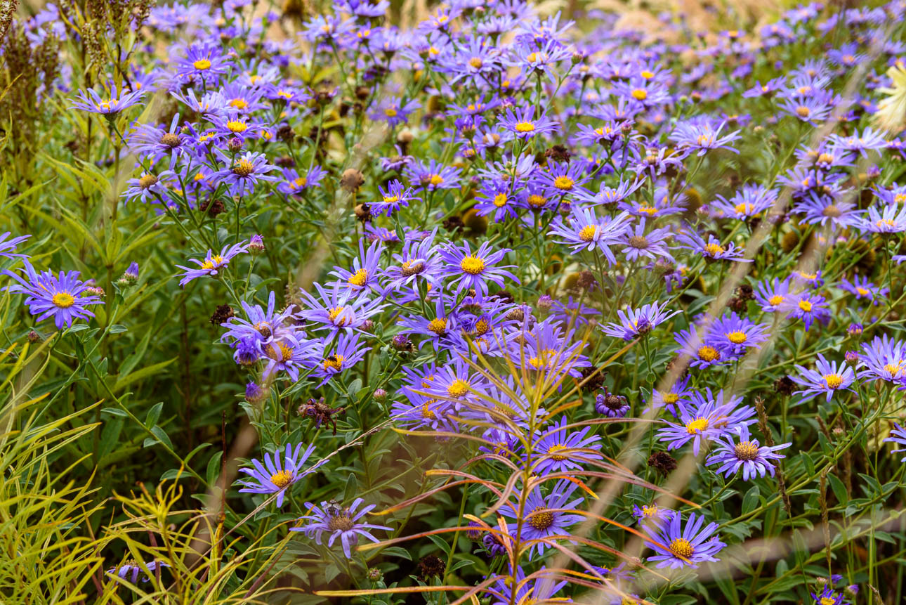 Aster ‚Mönch‘ zeigt einen locker-aufrechten, buschigen Wuchs mit gut verzweigten Trieben und mittelgrünen, leicht behaarten Blättern. Die zahlreichen Strahlenblüten leuchten in einem klaren Lavendelblau und besitzen eine kontrastreiche, gelbe Mitte. Wir kombinieren sie gerne mit Achnatherum calamagrostis und auch mit Echinacea ‚Alba‘ der fast zeitgleich blüht.
