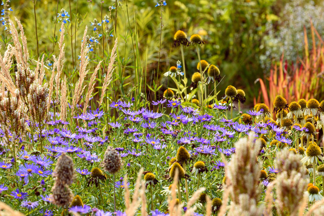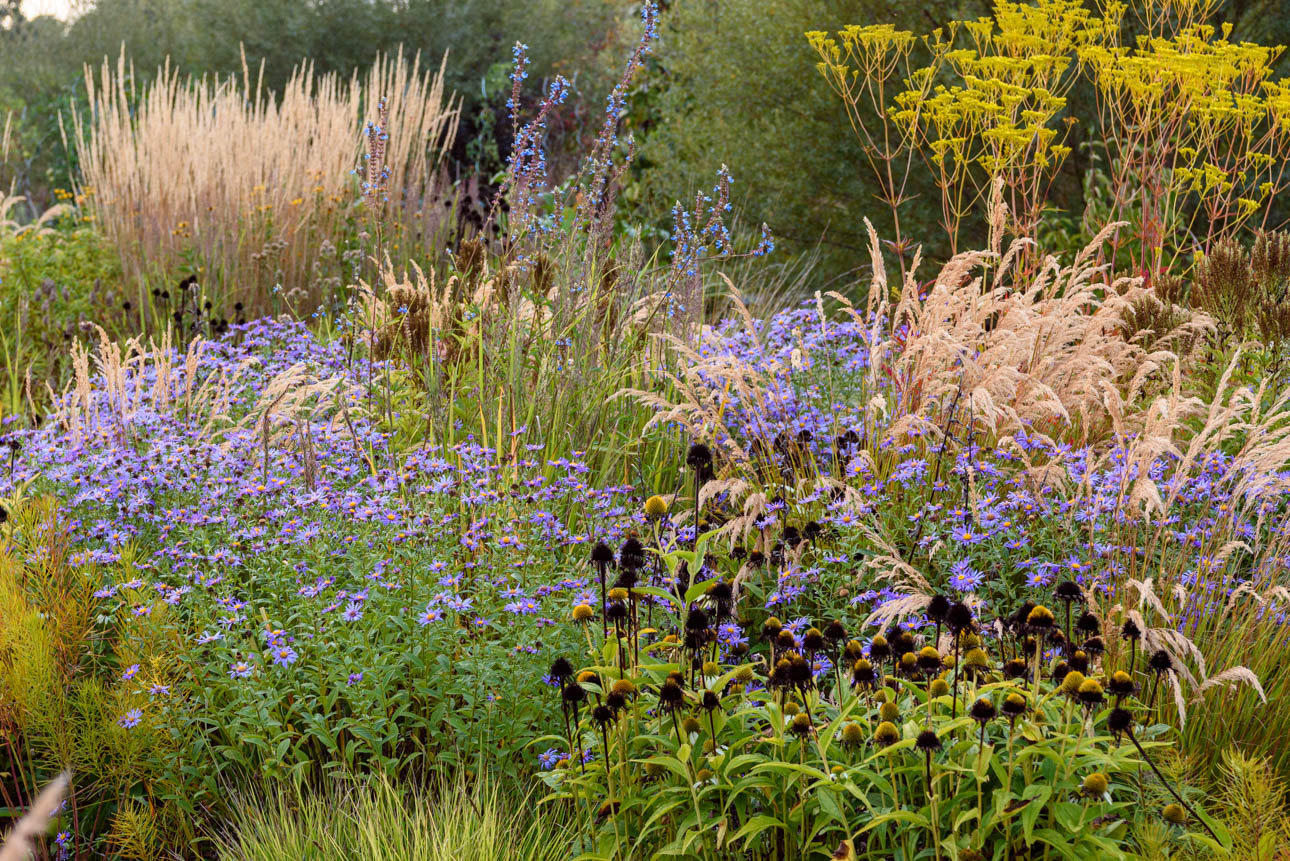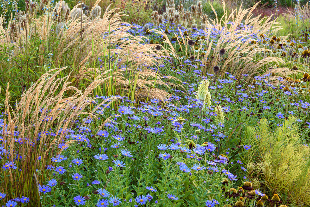 Aster ‚Mönch‘ zeigt einen locker-aufrechten, buschigen Wuchs mit gut verzweigten Trieben und mittelgrünen, leicht behaarten Blättern. Die zahlreichen Strahlenblüten leuchten in einem klaren Lavendelblau und besitzen eine kontrastreiche, gelbe Mitte. Wir kombinieren sie gerne mit Achnatherum calamagrostis und auch mit Echinacea ‚Alba‘ der fast zeitgleich blüht.