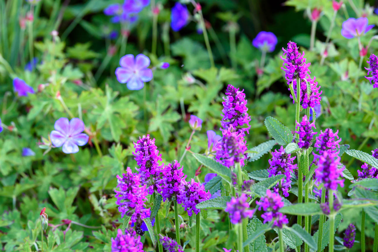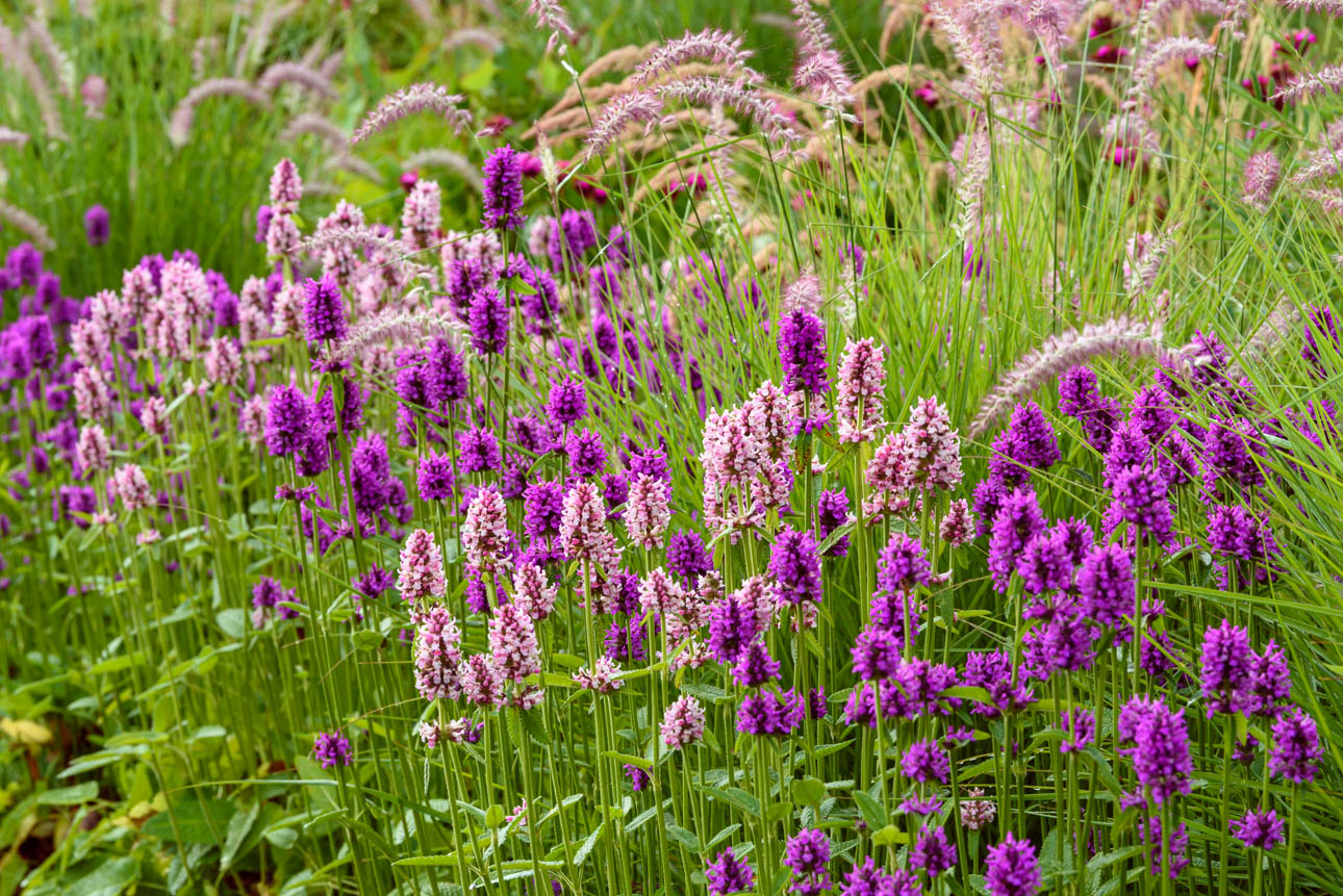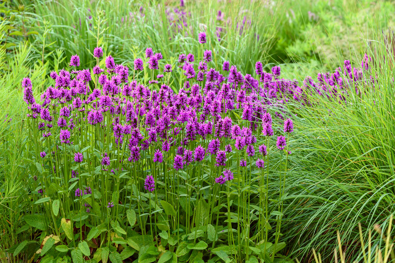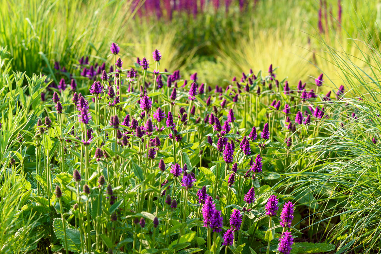 Betonica ‚Hummelo‘ bildet dichte, teppichartige Horste aus runzeligen, dunkelgrünen Blättern mit gekerbtem Rand. Über dem kompakten Laub erheben sich zahlreiche, straff aufrechte Stängel mit dichten, walzenförmigen Blütenähren. Passt gut zusammen mit Sesleria autumnalis.