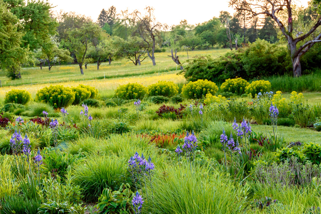 Camassia ‚Caerulea‘ bildet hohe, kerzenartige Blütenstände mit zahlreichen sternförmigen Einzelblüten aus. Ihr Laub wächst in dichten Schopfen aus schmalen, schwertförmigen Blättern von frischgrüner Farbe.